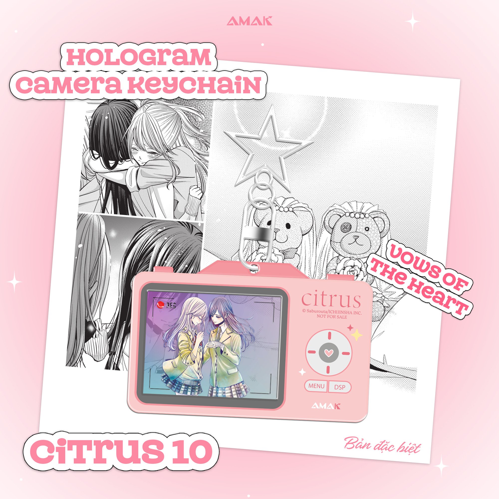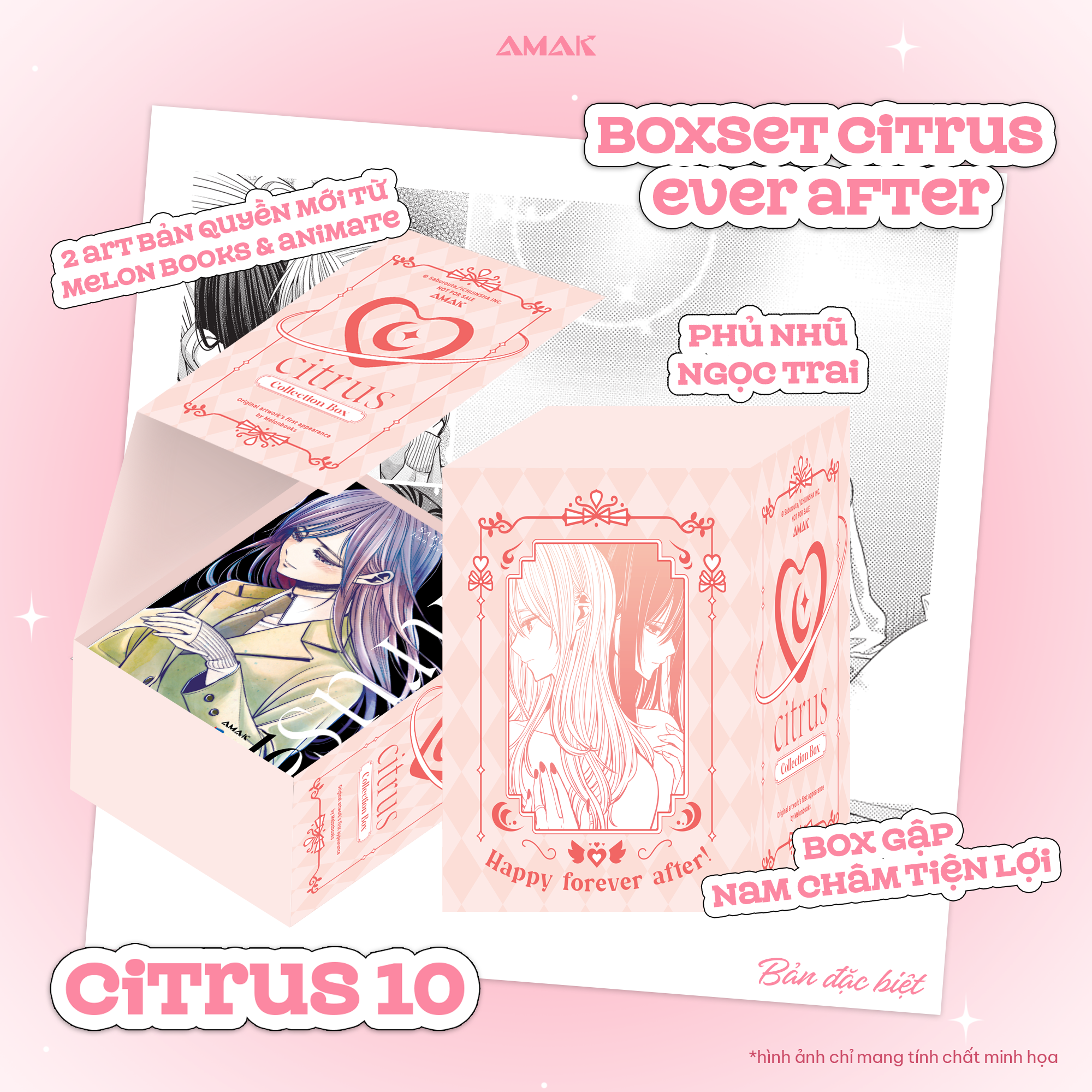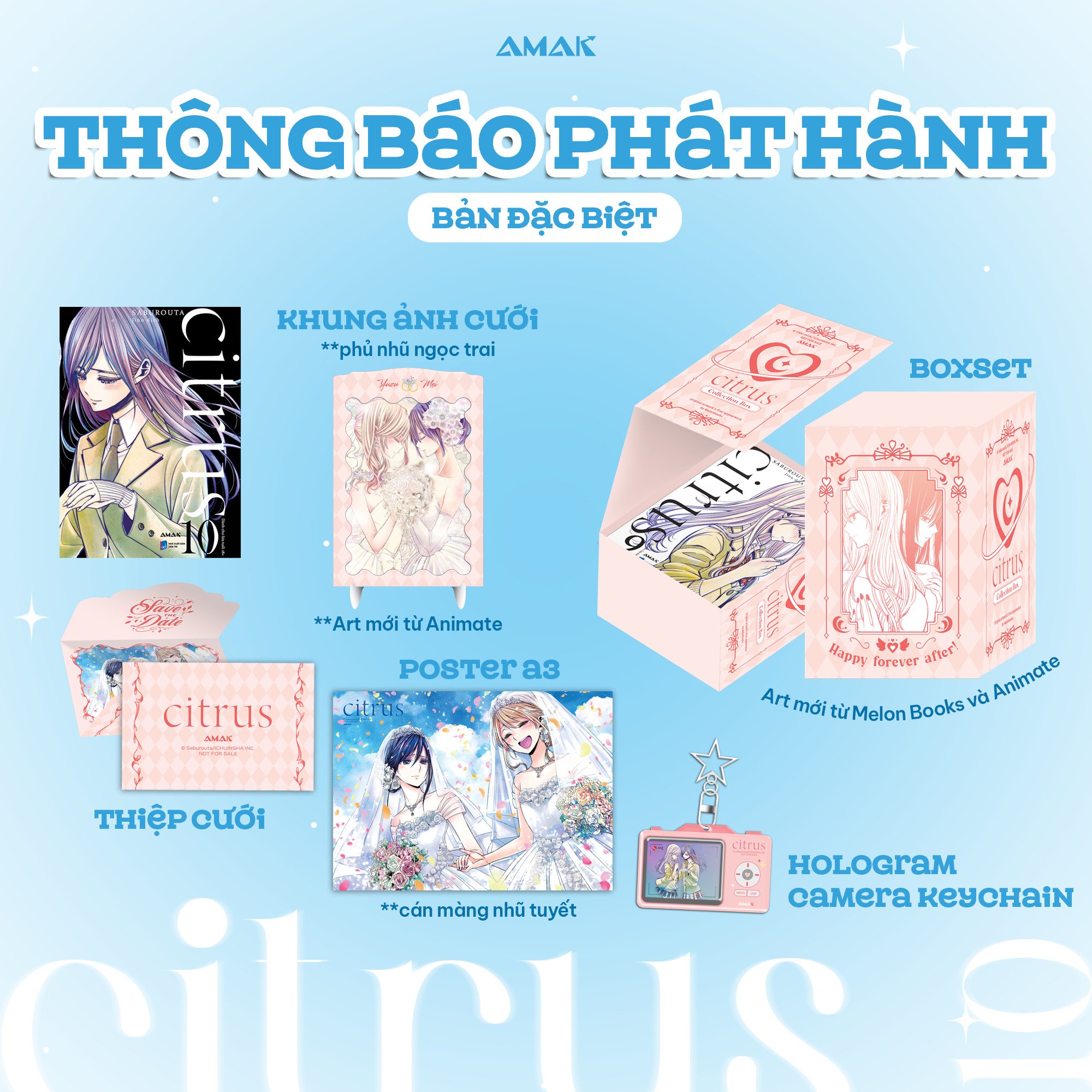 Tặng kèm 01 thiệp cưới phủ Hologram rực rỡ, 01 khung ảnh cưới ETERNAL LOVE phủ nhũ ngọc trai kèm giá đỡ (sử dụng art bản quyền mới từ Animate), 01 poster A3 cán nhũ tuyết; 01 Hologram Camera Keychain VOWS OF THE HEART, Boxset gập CITRUS EVER AFTER nhũ ngọc trai (sử dụng 2 art bản quyền mới từ Melon Books & Animate).