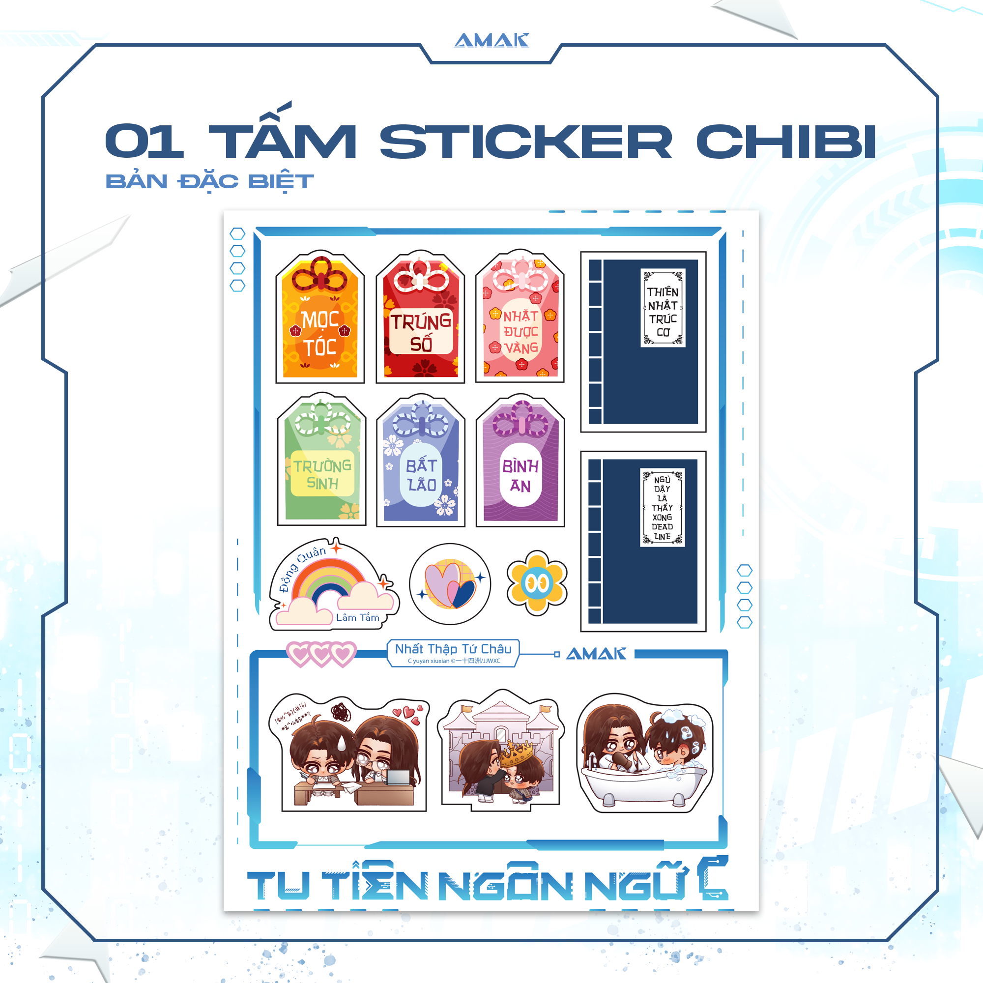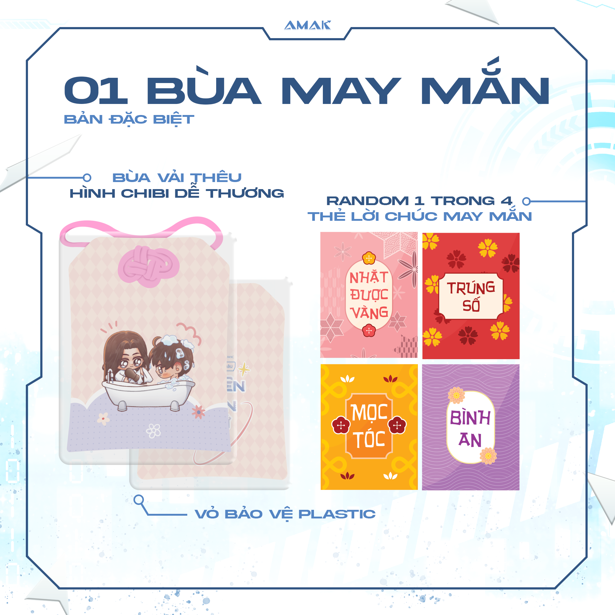 Tặng kèm Postcard cán nhũ kim tuyến, 01 tấm sticker chibi với những hình ảnh túi bùa may mắn, 01 bùa vải thêu hai mặt (4x6cm) kèm dây đeo và vỏ plastic mềm bảo vệ. Bên trong bùa đựng ngẫu nhiên 1 trong 4 mẫu thẻ may mắn với những lời cầu chúc hài hước siêu thực tế!